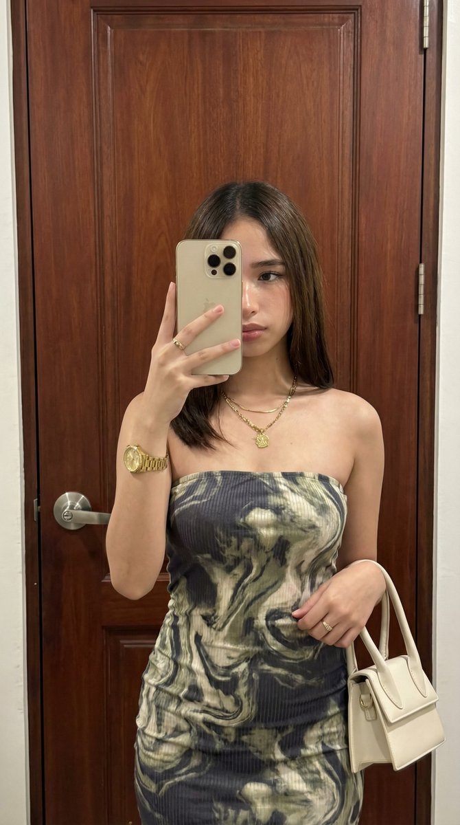 (9:16) Raw high-fidelity mirror selfie, eye-level, medium shot, iPhone 17 Pro sim, 35mm, f/2.8, sharp subject, natural grain. Framing: Subject ~65% frame, centered in mirror, large wooden door background, slight white wall edge, ~0.6m distance. Identity Lock: Preserve ALL facial features (structure, skin, hair, marks). Enhancement: Natural skin clarity (visible pores), even tone, soft glow, subtle light-based contour, refined highlights (eyes/lashes/brows), salon hair. Bio-Fidelity: Micro-pores, fine vellus hair, hydrated skin. Expression: Confident/poised gaze into phone via mirror, lower face partially occluded by phone. Hair: Same color/texture, long sleek waves, middle part, behind shoulders + over left shoulder, warm highlights. Makeup: Polished (filled brows, eyeliner, mascara), neutral nails. Accessories: Gold watch (left), layered gold necklaces, gold ring (right), beige/gold iPhone, small off-white handbag (left hand). Outfit: Strapless rib-knit bodycon dress, abstract marble (charcoal/olive/cream), tight fit, realistic folds, defined S-curve. Pose: Torso angled ~30° left, hips toward mirror, right hand holding phone at face level, left holding bag, natural articulation. Mood/Color: Chic, confident; palette (mahogany, charcoal, olive, cream, gold), ~3500K warm indoor light, moderate contrast. Environment: Indoor dressing/hallway, mahogany door w/ silver handle, white wall edge, soft overhead lighting, all sharp.