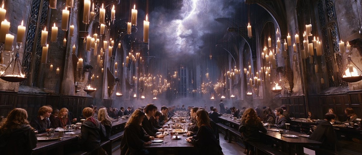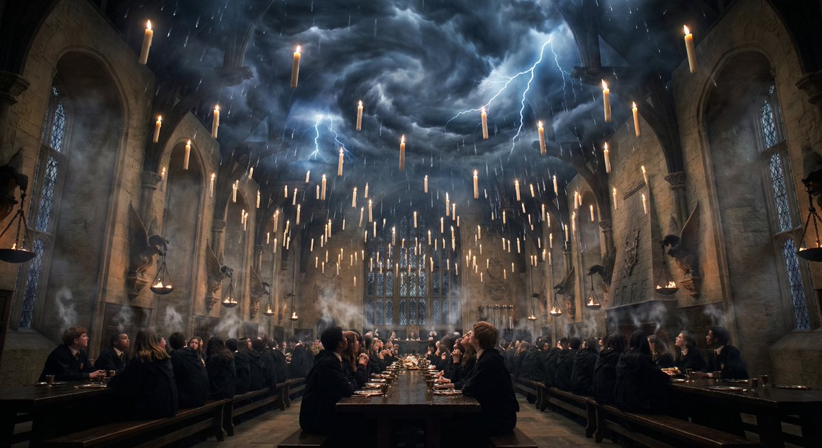 The Great Hall of Hogwarts during a thunderstorm, the enchanted ceiling showing violent lightning striking directly overhead, thousands of floating candles flickering wildly, rain phasing through the magical ceiling and evaporating inches before touching the students, long tables stretching into foggy darkness, gothic architecture dripping with atmosphere