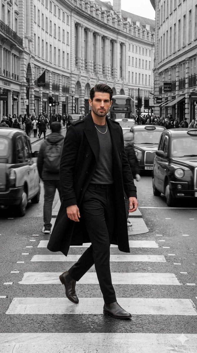 Hyper-realistic cinematic street portrait of a stylish young man crossing a busy city street, wearing a black trench coat and dark outfit, confident serious expression, shallow depth of field, blurred pedestrians and traffic in background, monochrome black-and-white environment with subject in color, natural lighting, editorial photography, high detail, vertical 9:16.