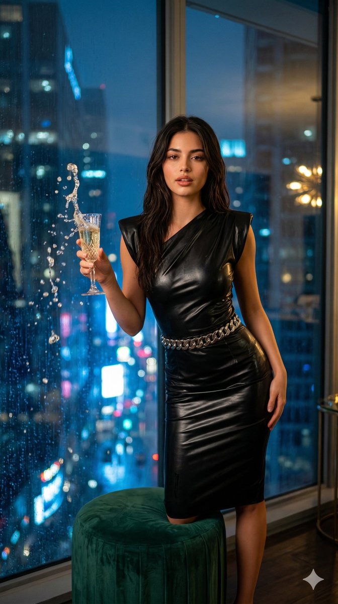 A hyper-realistic editorial shot of myself, keeping my exact face unchanged. IMPORTANT: Do not alter the face of the reference face; the output must have 100% exact facial features as the reference image. I am standing atop a plush emerald velvet stool in a high-rise penthouse, leaning slightly forward with a playful but sophisticated expression. In my right hand, I hold a vintage crystal flute as champagne overflows in mid-air, capturing every glistening droplet. I am wearing an asymmetrical black latex midi dress with structured, padded shoulders and a wide silver chain-link belt that cinches the waist. The background features floor-to-ceiling glass walls overlooking a rain-slicked city at night, with blurred neon lights creating a vibrant bokeh. The lighting is a mix of cool blue ambient tones from the city and warm, directional gold point lights from the interior chandeliers, creating a luxurious rim light. Shot on a 35mm f/1.4 lens with a fast shutter speed to freeze the liquid motion, ensuring pristine 8k clarity with no artifacts. Ensure the output maintains 100% exact facial features from the reference image; do not alter the face.