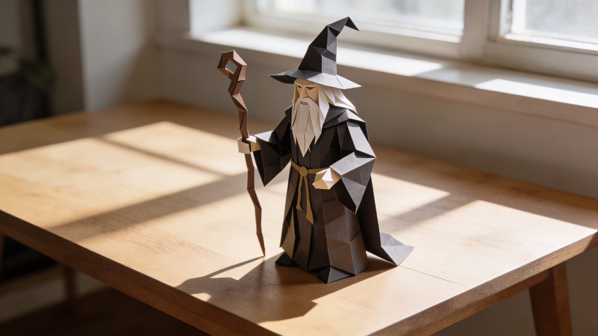 hyper-realistic close-up of a stunning origami sculpture of **{argument name="thing" default="thing"}** made from intricately folded paper, displayed on a minimalist wooden table, extremely detailed and precise paper folds, crisp edges, subtle shadows in every crease, realistic paper texture with visible fibers and slight translucency, soft natural window light casting gentle dramatic shadows that highlight the origami structure, elegant and artistic composition, clean background, masterpiece, ultra detailed, photorealistic paper artRelated Nano Banana Pro Prompts