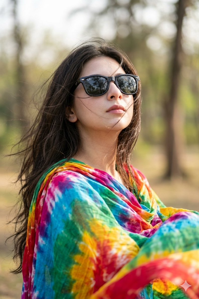 Maintain the same face and person (use attached photo for accurate face Hyper-realistic 16k Image Portrait Use facial feature of attached photo.Using the female face in the image from this uploaded photo,with a open hairstyle,a thin,thin,and slightly messy haircut to frame the face,and sunglasses (100% similar),creates the following image:a daydreaming expression.Her hair swayed in the wind,moving freely,colorful chunri.creating a romantic and airy feel.
