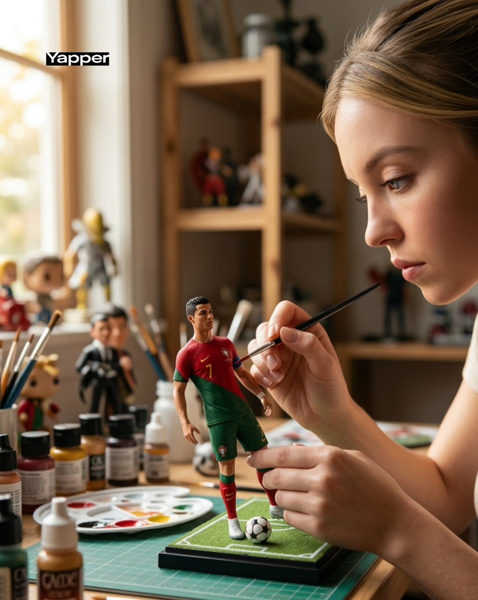 A prompt for generating a hyper-realistic scene of a focused female artist carefully painting a highly detailed miniature collectible figurine of a famous Portuguese football star (inspired by Cristiano Ronaldo), emphasizing cinematic lighting, shallow depth of field, and a collectible statue craftsmanship aesthetic.