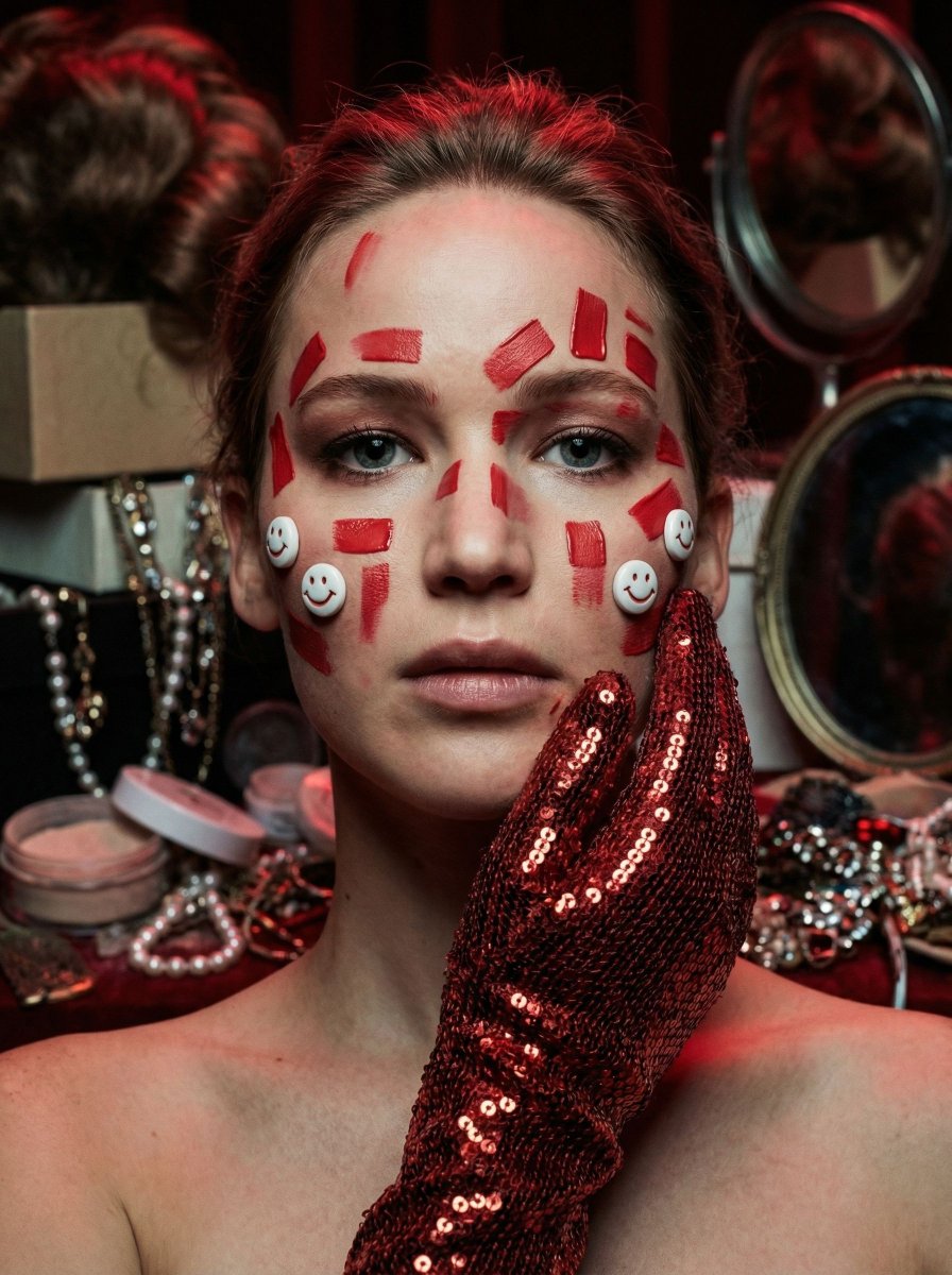 A highly detailed, structured prompt for generating a hyper-realistic, surrealist fashion portrait of Jennifer Lawrence in a cluttered theater dressing room, emphasizing tactile textures, dramatic crimson lighting, and specific camera/film stock effects (Cinestill 800T).