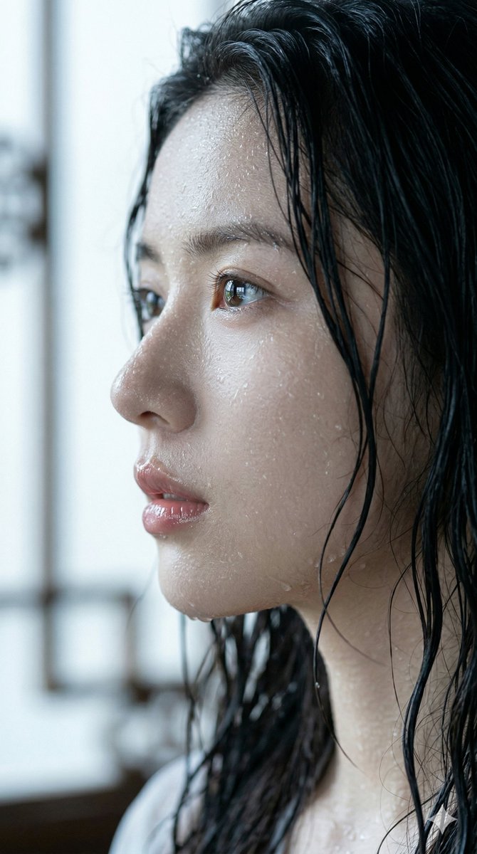Use the person's facial features without any changes. "Extreme wet close-up portrait, young woman's profile. Dark wet hair naturally clings to the skin. Tiny water droplets and sweat beads sparkle on the face, realistic and natural. Focus on bright, natural eyes, reflecting real light and shadow. Hydrated, shiny lips, soft, natural skin texture. Soft lighting, cool tones, light gray and white bokeh background. Hyper-realistic, 8K resolution, cinematic photography, raw style." "Negative Prompt": Avoid "excessive oiliness, oily skin, dry skin, heavy makeup, cartoon, illustration, 3D rendering, low quality, blur, eye deformation, anatomical errors, overexposure, high contrast", “Parameters”: "Aspect Ratio": "9:16", Style: Realistic