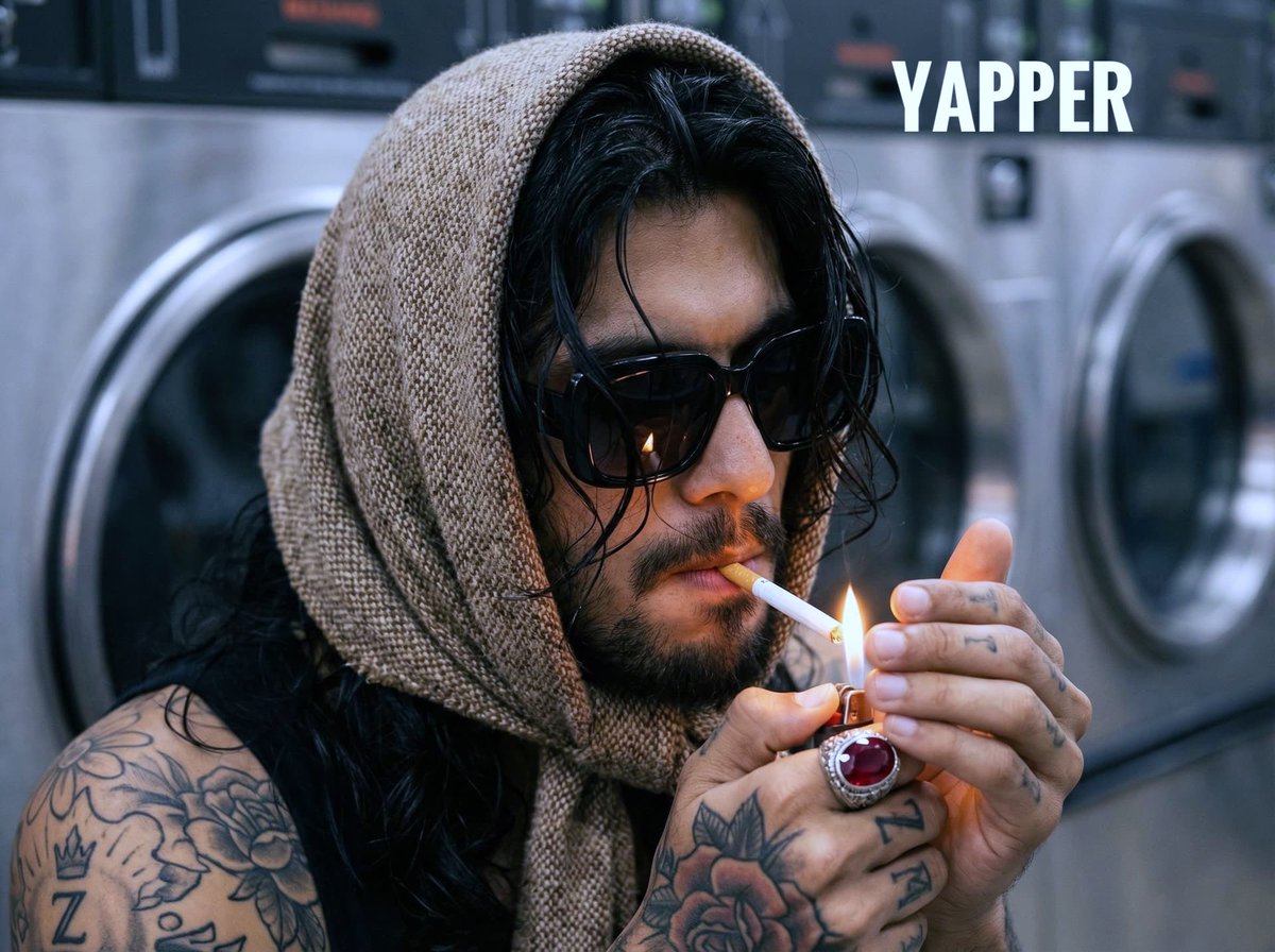 Deep hyperrealistic close-up portrait (angle from shoulder level, focussing with long, slightly wet wavy black hair, sticking out from under a tightly tied scarf on the head made of rough tweed wool into a small cage of sand-beige and brown shades. A man in profile 3/4, his face is partially shaded, but illuminated by the warm, flickering light of the flame of the lighter, which he holds in his mouth at the cigarette. He's wearing black sunglasses in a vintage massive frame. The man's hands, detailed tattooed with complex floral patterns and a rose, frame the lighter. At the base of the thumb you can see a clear tattoo in the form of the letter Z with a crown. On the middle finger of the right hand there is a massive silver ring with a large, deep, facetted ruby in the shape of a cabochon, sparkling in the light of the flame. Skin pores, individual beard hairs, tobacco texture in a lit cigarette and scarf tweed weaving are conveyed with maximum clarity and detail. The background is blurred (bokeh f/2.2), metal, industrial surfaces of laundromat (self-service laundry), vaguely outlining round hatches of stainless steel washing machines. Colour palette: dominant warm sand, brown and beige shades of wool, contrasting with cold gray metal background surfaces and deep black glasses. Accents: warm golden flame, rich red ruby, whiteness of the cigarette filter and shirt collar. Camera: Fujifilm GFX100s, lens GF85mmF1.7 R WR. Settings: f/2.2, 1/320 sec, ISO 6400. Lighting: mixed (dim laundry light and dominant warm light from the lighter flame). Film granularity: minimal, for preservation The depth of field is very small.