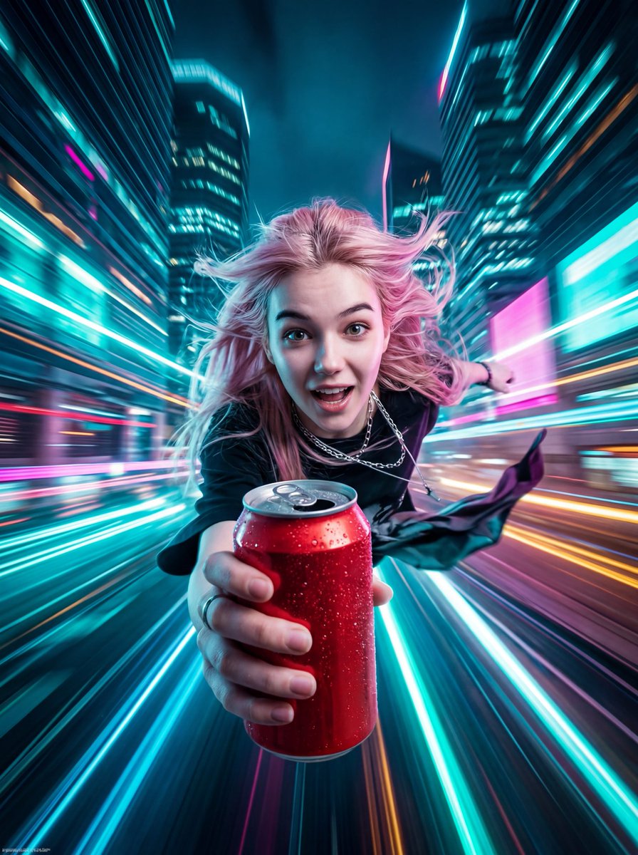 use female subject, same identity consistency -- ultra-dynamic first-person wide-angle cinematic shot, 20mm lens, racing at extreme speed through a neon city at night, camera starts in high-speed chase behind a flying girl then sweeps around into a frontal lock-on shot, stabilizing on a vivid red soda can held toward the lens, young woman with wind-swept hair, intense adrenaline expression, mid-air flight pose, streamlined body, eyes wide with excitement, futuristic neon metropolis below with cyan magenta amber light trails, skyscrapers bending into motion tunnel, strong motion blur environment, soda can ultra sharp foreground with condensation droplets, cinematic lighting, neon blue teal with warm orange red reflections, clothing flowing violently in wind, hyper-lapse energy + smooth stabilization, surreal speed, immersive, high contrast, ultra realistic, film grain, volumetric light, dynamic perspective --ar 9:16 --style raw --v 7 --stylize 75