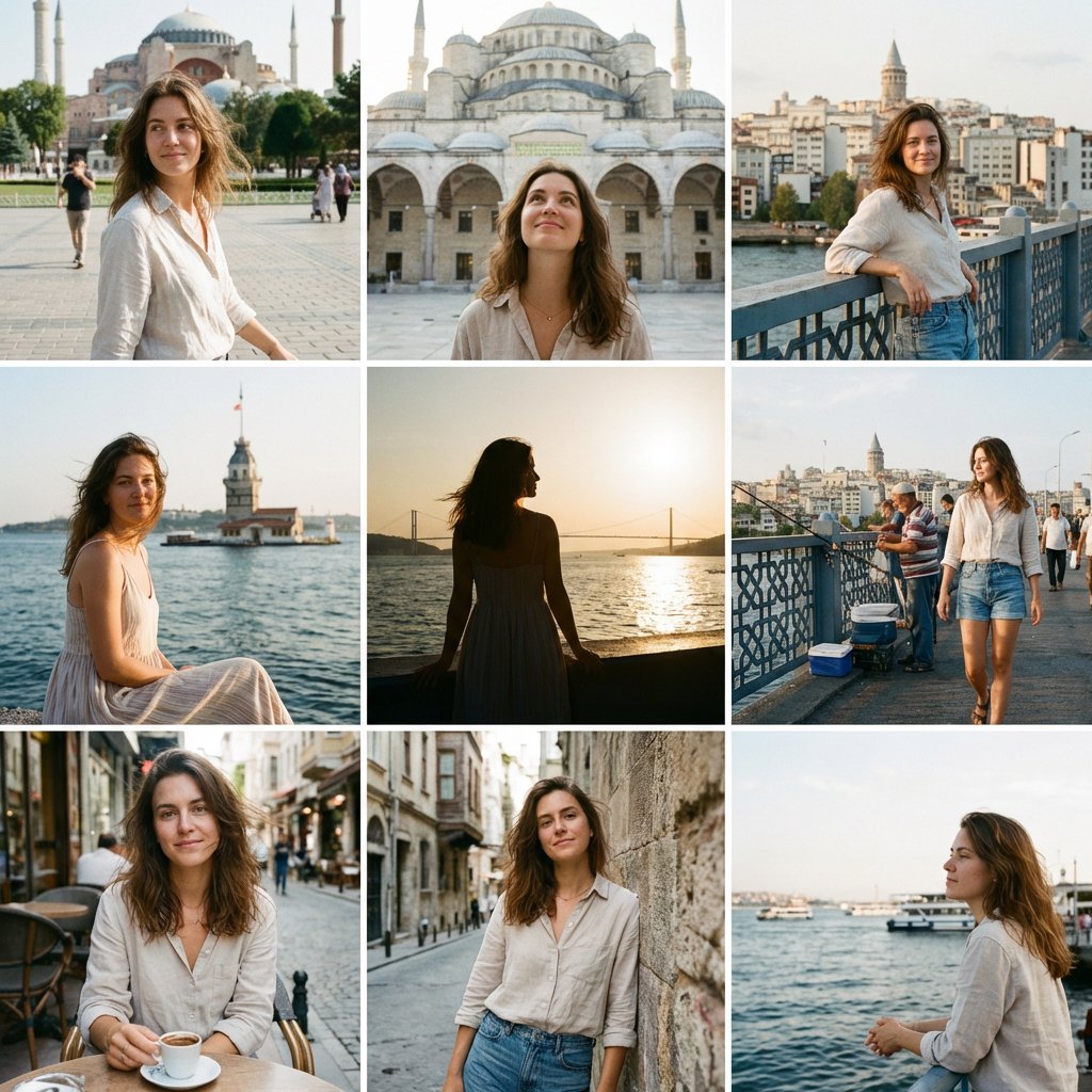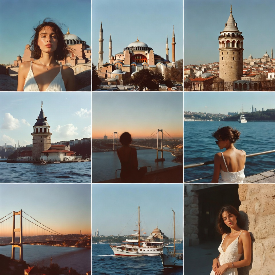 "objective": "Create a 3x3 Instagram feed grid featuring an attractive, sensual woman traveling in Istanbul, captured in natural smartphone-style photos",