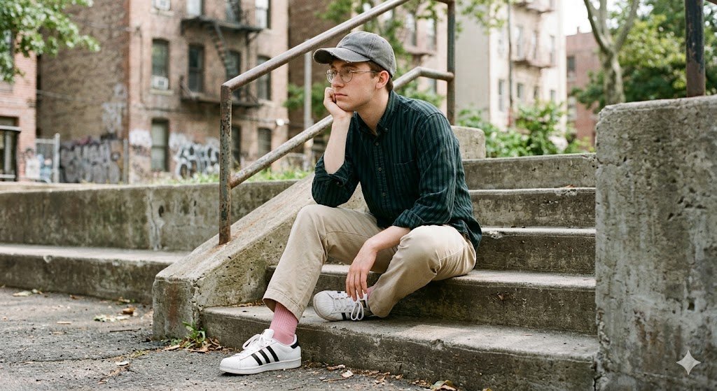Young man sitting on concrete stairs in a relaxed pose, wearing a dark {argument name="shirt color" default="green"} striped button-up shirt, beige pants, pink socks, and white sneakers with black stripes. He rests his chin on his hand, looking thoughtfully to the side. Wears round glasses and a gray baseball cap. Urban outdoor setting, natural lighting, soft focus on background, realistic style, casual and introspective mood, full-body shot, slightly low angleRelated Nano Banana Pro Prompts