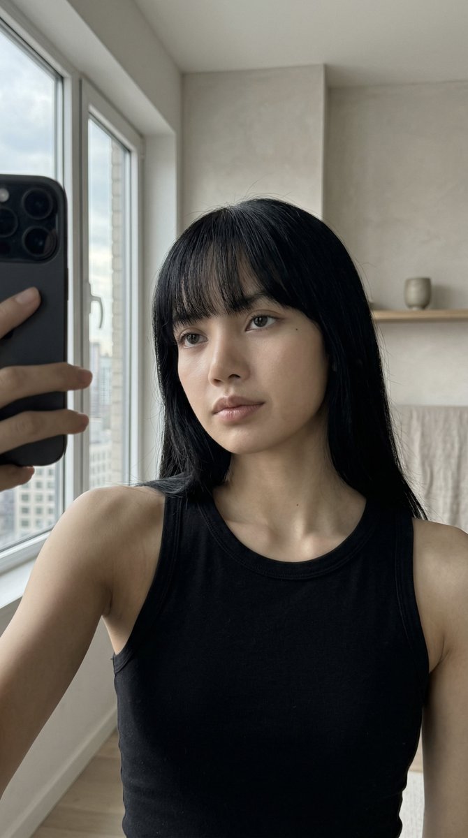 "style": "raw iphone front camera selfie, natural window light, no portrait mode, slight grain"