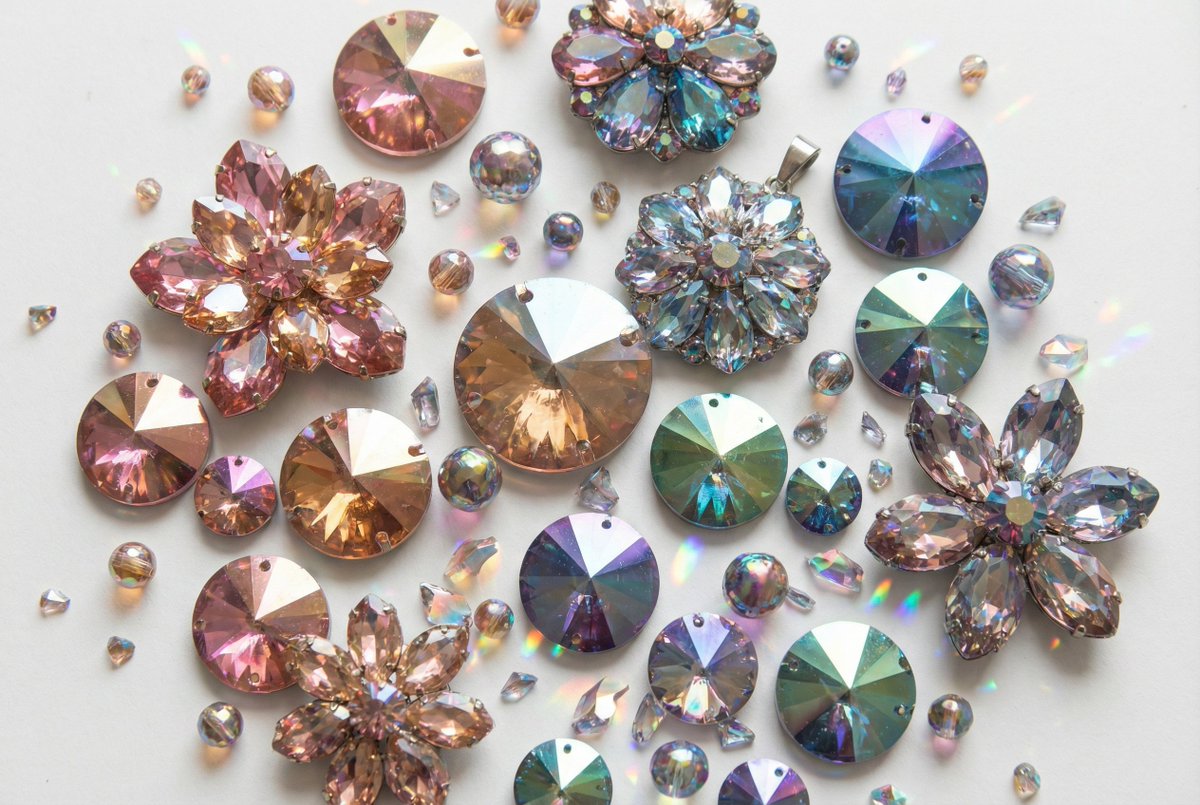 A prompt for generating a product photography image featuring a collection of iridescent, faceted, jewel-like objects arranged on a white background. The objects are shaped like flowers and circles, reflecting light prismatically with a metallic sheen.