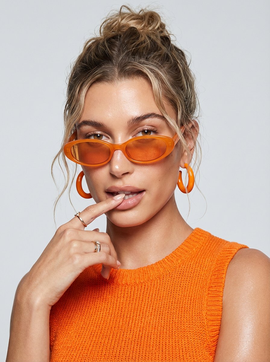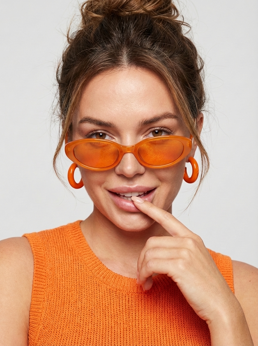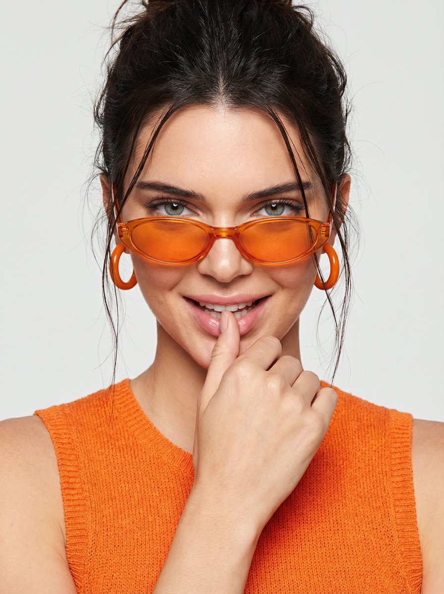 "sunglasses": "narrow oval sunglasses, black frame with vivid orange tinted lenses, worn low on the nose below the eyes"