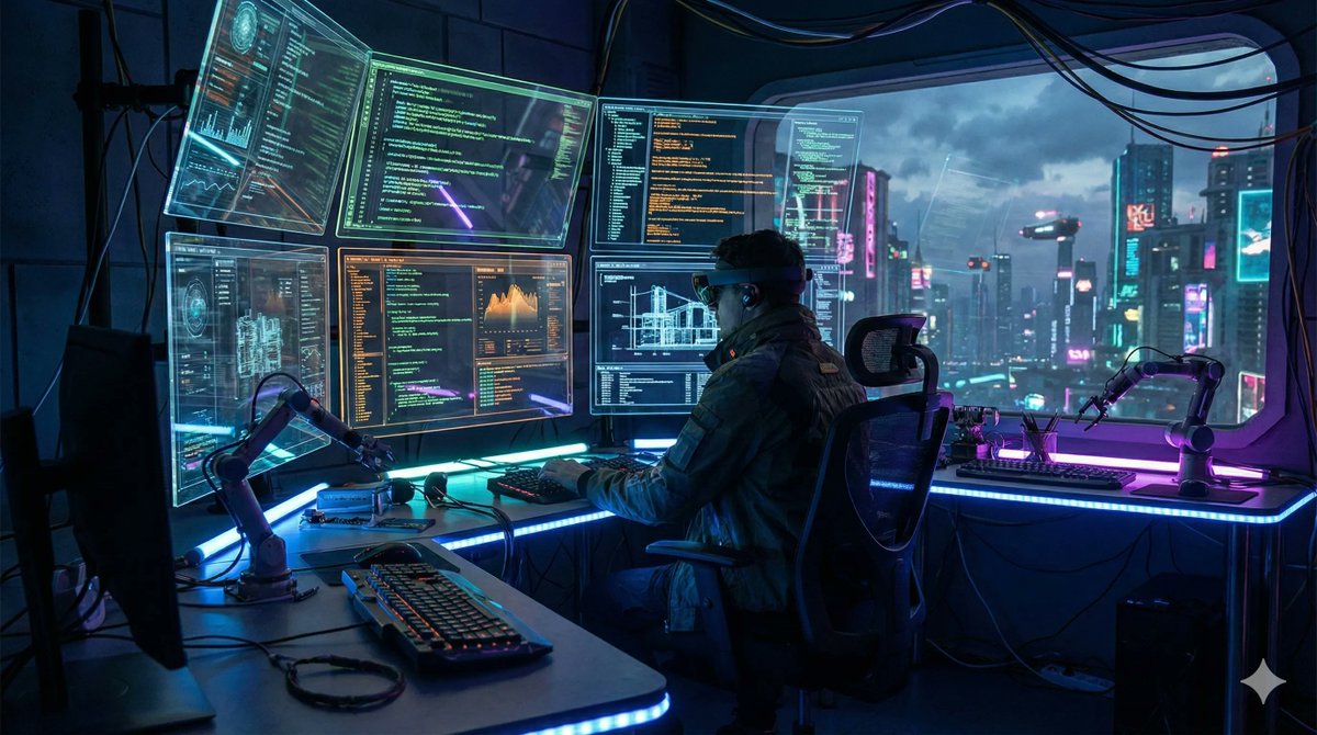 "scene": "futuristic AI workspace with holographic screens showing code",