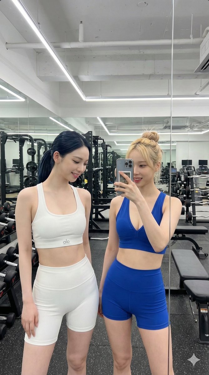 A realistic medium shot in a gym with mirrored walls featuring Karina and Winter from aespa. On the left, Karina has a sharp, AI-like visual with a slender physique and pale fair skin, her dark blue-black hair tied in a ponytail, wearing a white Alo Yoga ribbed sports bra and biker shorts set, smiling while looking down with minimal makeup. On the right, Winter has a petite, toned body and very fair skin, her bob-cut blonde hair pinned back in a messy bun, distinct soft features, wearing a royal blue deep V-neck sports bra and shorts set, smiling at her phone while taking a mirror selfie. The background is filled with weight racks, benches, and gym equipment, illuminated by bright overhead LED strips. --ar 9:16