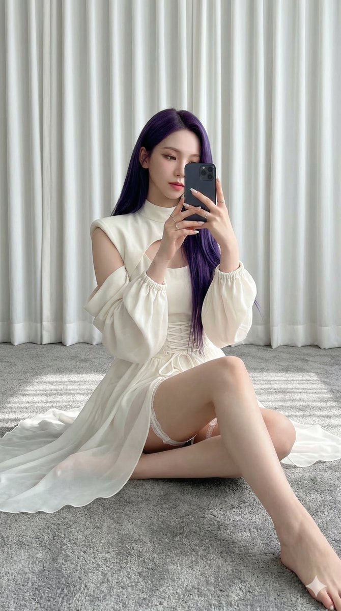 In a vertical composition of elegant proportions, Karina from aespa is seated upon a soft, grey-carpeted floor, her figure captured in a moment of poised, modern grace. She possesses a lithe and delicately curvaceous build, her skin radiating a luminous, porcelain fairness that speaks of her Korean heritage, smooth and ethereal against the muted backdrop. Her presence is one of striking aesthetic harmony, characterized by her sharp, feline-like facial features, refined symmetry, and a sophisticated, supermodel-like allure. Long, silken tresses of vibrant deep purple flow downward, veiling her shoulders and reaching toward the floor in a vivid cascade of color. She holds a dark smartphone before her face, her slender fingers adorned with a simple ring and pale, manicured nails, creating a focal point of contemporary mystery. She is dressed in a complex, ivory-white ensemble that blends delicate textures; a high-collared, sleeveless bodice features a circular cutout at the chest and draped, voluminous sleeves that gather at the wrists. The garment is cinched at the waist with intricate lace-up detailing, flowing into a sheer, skirt-like overlay that rests against her legs. Complementing the attire are white lace garters cinched around her thighs, adding a layer of intricate detail to the soft contours of her physique. The setting is minimalist and serene, defined by the neutral, textured carpet below and a backdrop of heavy, white draped fabric that falls in soft, vertical folds. The lighting is diffused and even, casting gentle shadows that define the subtle musculature of her arms and the graceful curve of her pose, bathing the entire scene in a clean, high-fashion glow that emphasizes the vivid violet of her hair against the pristine whites of her surroundings. —ar 9:16