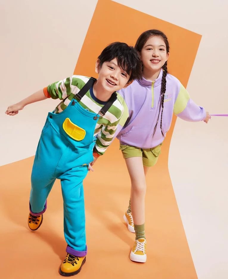Kids' fashion editorial photography, two children walking dynamically, turquoise overalls with yellow pocket, lavender and lime green hoodie, striped shirt, hiking boots and yellow sneakers, minimalist studio setting with diagonal orange geometric background, high-angle shot, vibrant saturated colors, soft studio lighting, 8k resolution, clean commercial aesthetic.