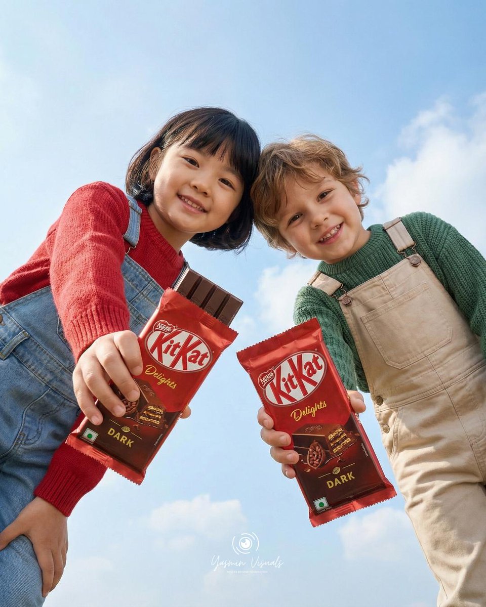 A cute young girl with short black hair and bangs smiling while holding a {argument name="chocolate bar color" default="red"} KitKat Dark chocolate bar covering one eye, resting her cheek on her hand, wearing a cozy red and beige patterned winter sweater. The background and table are solid bright {argument name="background color" default="red"}. Several KitKat chocolate bars are placed on the table in front of her. Soft studio lighting, vibrant colors, commercial food advertisement style, ultra-realistic photography, sharp focus, high detail, 50mm lens, shallow depth of field, professional product photography, centered composition.Related Nano Banana Pro Prompts