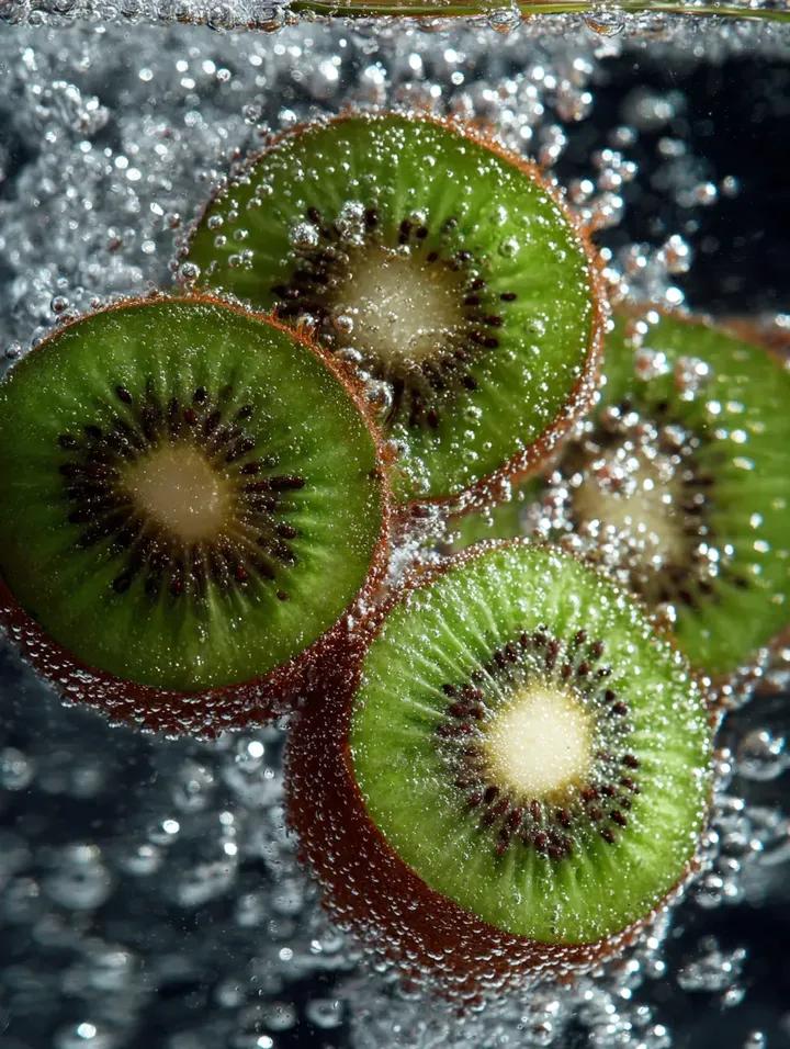 Kiwi 🥝 slices floating in sparkling water with crisp bubbles and refreshing macro detail