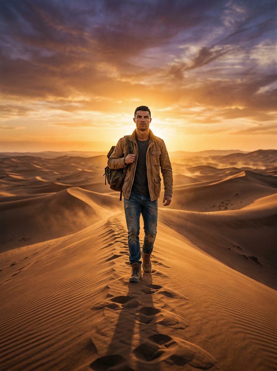 Nano Banana Pro AI image example generated with this reusable CDance AI prompt: A prompt for Gemini Nano Banana 2 to generate a hyper-realistic cinematic photograph of a lone traveler in the Saharan dunes, emphasizing…