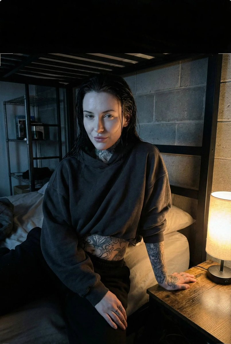Nano Banana Pro AI image example generated with this reusable CDance AI prompt: A structured JSON prompt for Nano Banana 2 to generate an ultra-photorealistic, low-light portrait of a tattooed woman in an oversized…