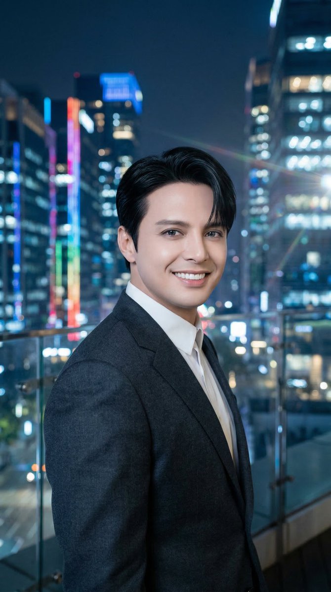 Luis Miguel as a Korean pop star from Seoul, smooth fair East Asian skin tone, jet black straight hair with slight side sweep, wearing a stylish tailored dark suit, standing in Gangnam district at night, modern glass towers lit up behind him, subtle lens flare, photorealistic, cinematic portrait photography, 85mm lens