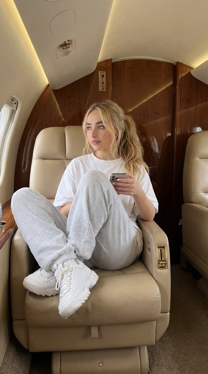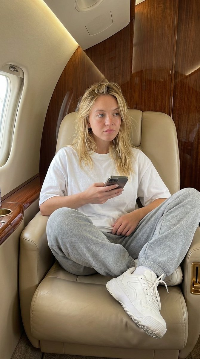 full body photo of a stylish young woman sitting inside a private jet cabin, luxury interior with beige leather seats and polished wooden panels, soft warm ambient lighting, outfit: oversized white t-shirt, relaxed fit sweatpants, chunky white sneakers, minimal jewelry, holding a smartphone, pose: relaxed seated pose with one leg bent on seat, natural hand movement, looking slightly to the side with calm confident expression, environment: private jet interior, window light softly illuminating face, clean composition, luxury lifestyle aesthetic, camera: handheld iPhone style, slightly candid, sharp focus, realistic skin texture, natural lighting, style: ultra realistic, editorial fashion, no text, no watermark, no logo --ar 2:3 --style raw --v 7 --stylize 100