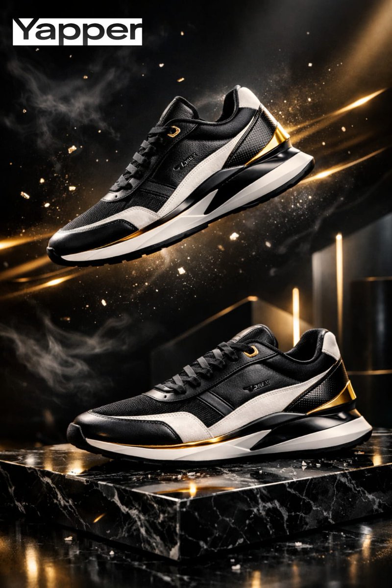 "placement": "hero sneaker floating slightly above a glossy black marble platform",