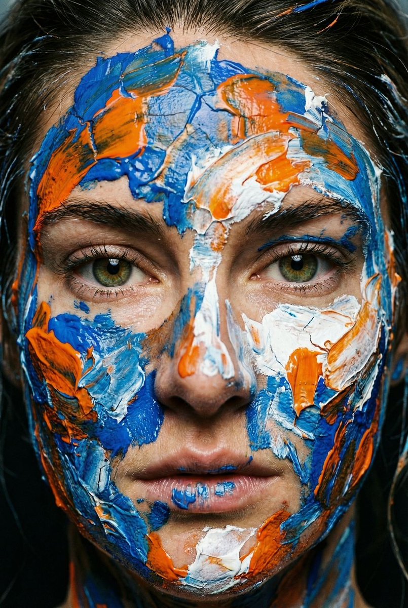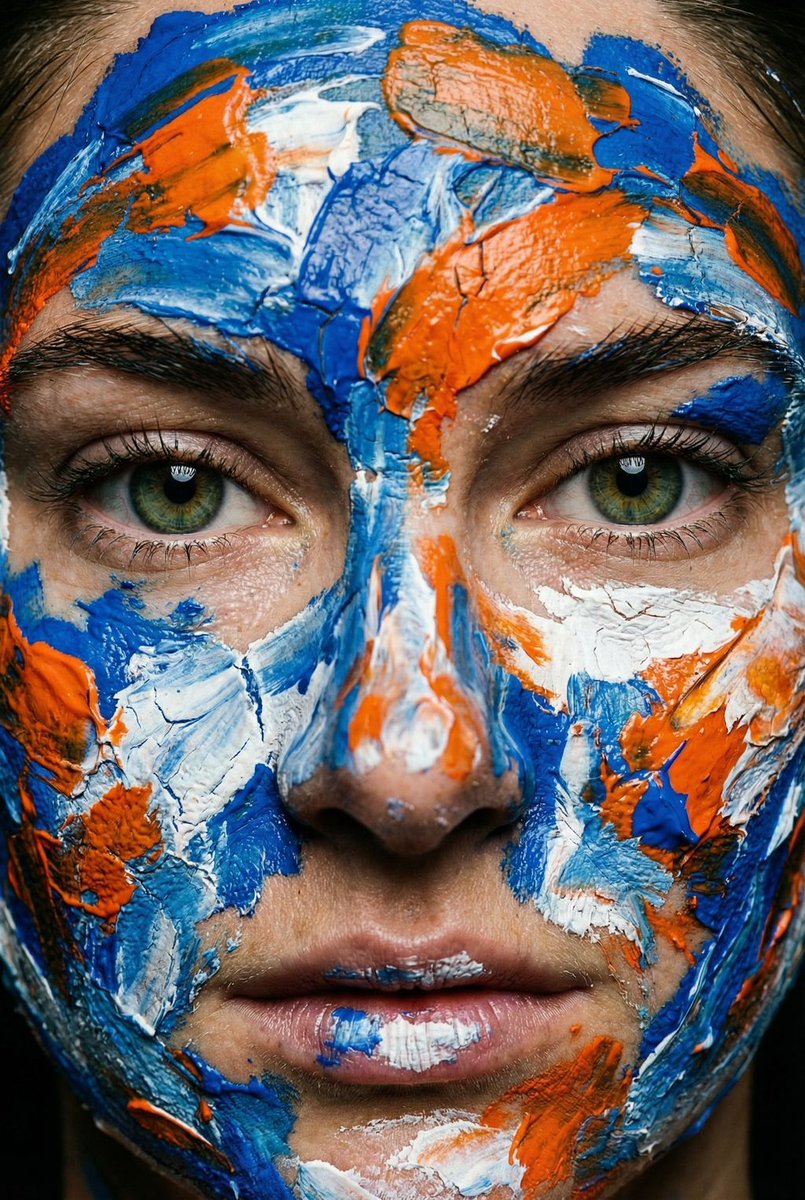 "master_prompt": "Extreme close-up macro portrait of The Protagonist, transforming the human face into a living avant-garde canvas. The subject's skin is heavily textured with thick, impasto applications of physical acrylic paint in chaotic strokes of {argument name="color 1" default="cobalt blue"}, {argument name="color 2" default="cadmium orange"}, and {argument name="color 3" default="titanium white"}. Crucially, the paint must look physically wet and heavy, with visible cracks and ridges casting micro-shadows on the skin. The eyes remain untouched, sharp, and piercingly clear, creating a hyper-realistic focal point amidst the abstract colors. Shot on a Hasselblad H6D-100c with a 120mm f/4 Macro lens to capture individual skin pores beneath the drying paint. Lighting is a dramatic, high-contrast 'Rembrandt' setup that highlights the 3D topography of the paint strokes. Analog film aesthetic with the fine grain of Kodak Ektar 100. No digital painting effects; this is practical makeup FX photography.",