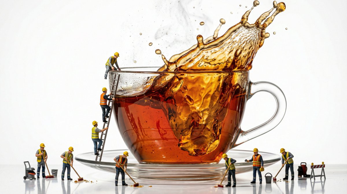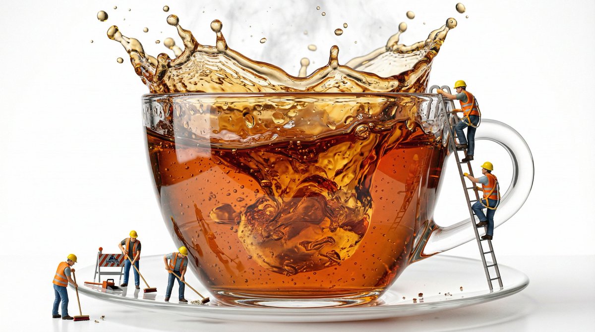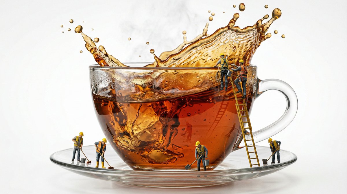 "prompt": "Ultra-realistic 8K macro product shot, pure white background. Giant transparent glass teacup with dramatic hot tea splash frozen mid-air. Tiny construction workers in yellow helmets climbing ladders on the rim, sweeping the saucer. Steam particles rising, rich amber liquid texture, dramatic studio lighting with high-contrast shadows and reflections",