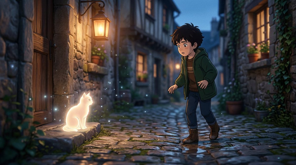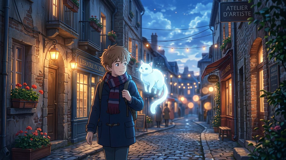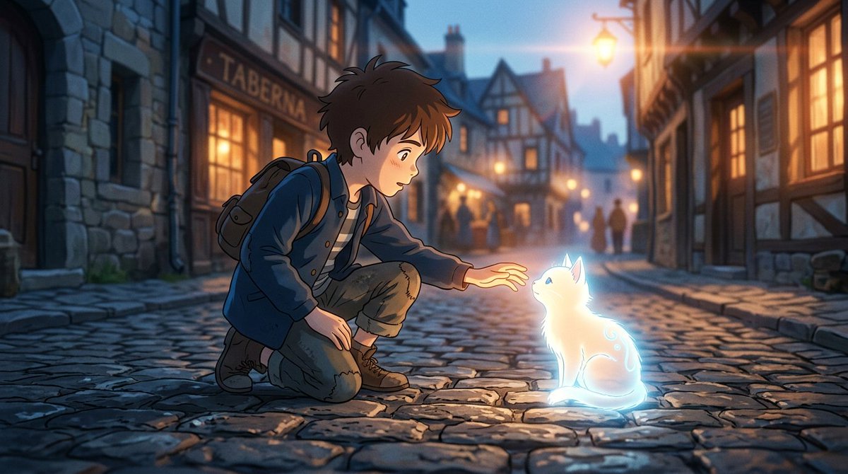 Anime cinematic style, Makoto Shinkai inspired, soft blue hour lighting, narrow European cobblestone alley, warm shop lights, dreamy atmosphere, shallow depth of field, soft bloom, lens flare, highly detailed, consistent character: young boy with messy light brown hair, navy coat, scarf, white fluffy spirit cat with faint glow