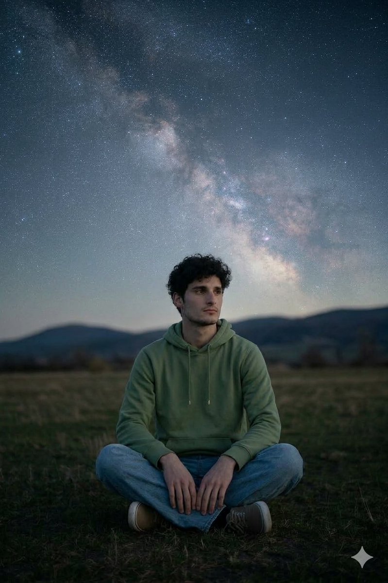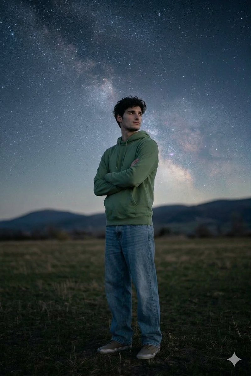 A prompt for Google Gemini Nano Banana Pro to generate a cinematic, realistic image of a young man standing in an open field at night under a wide, star-filled sky, focusing on peaceful atmosphere, detailed lighting, and night photography style.