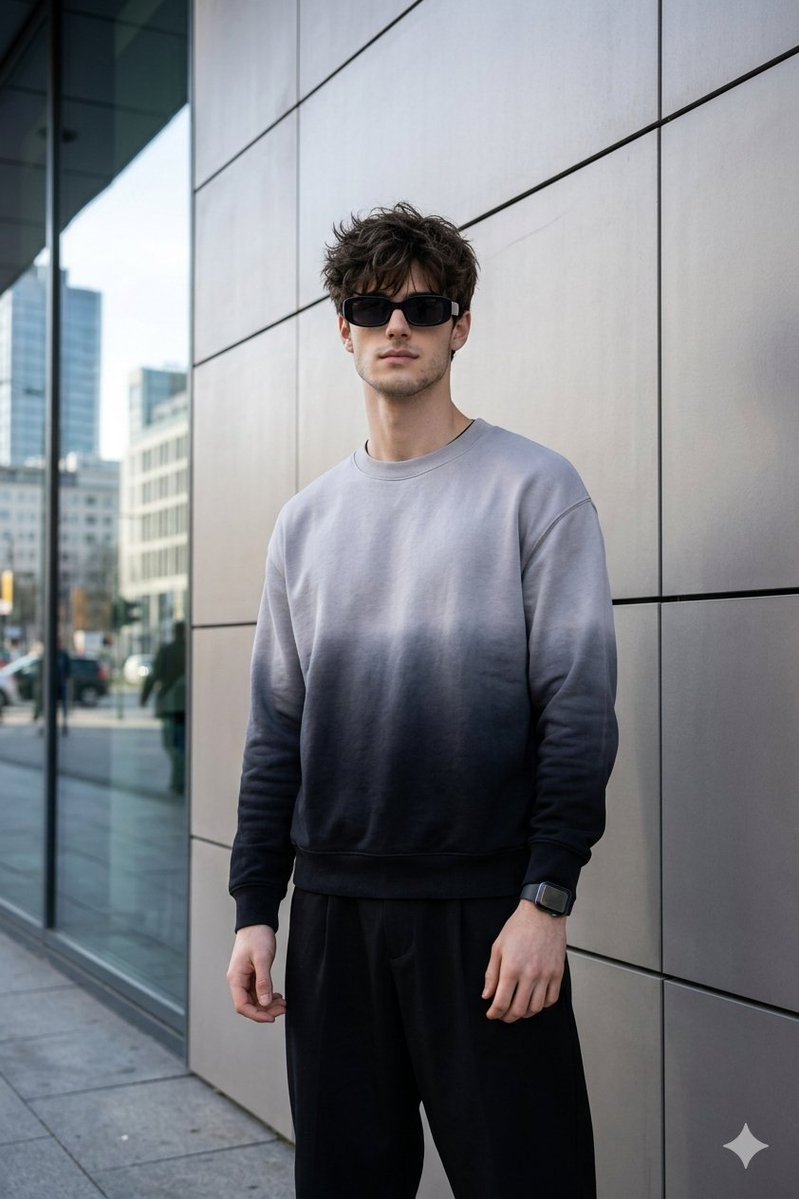 Masterpiece, 8K, UHD, cinematic portrait, a stylish man (completely identical to the reference image), standing confidently against a modern architectural wall with large sleek tiles. His face and hairstyle are perfectly matched to the reference. He wears a gradient sweatshirt (soft light gray at top to deep black at bottom), loose black pants, dark sunglasses rectangular shape, and a smartwatch on his left wrist. Reflective glass windows, subtle urban elements, distant buildings, street textures. Ambient natural daylight, soft shadows and highlights enhancing facial features, fabric textures, and glass reflections. Sharp focus, shallow depth of field, ultra-realistic, lifelike skin tones, high dynamic range, fashion photoshoot, contemporary city vibe.