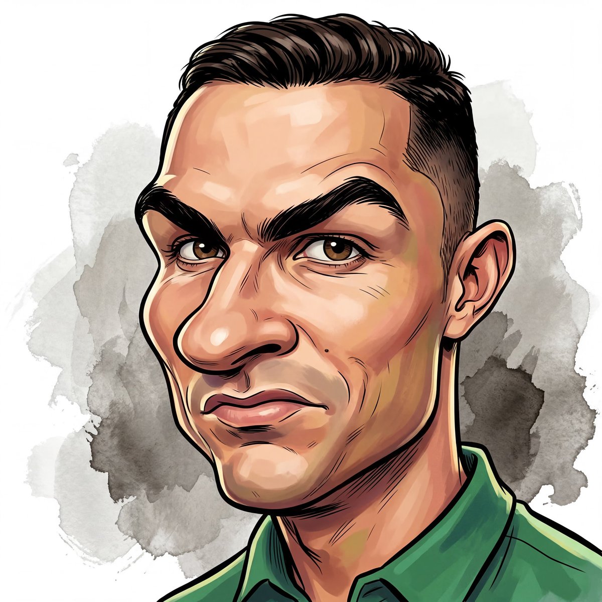 Masterpiece-level political caricature illustration, hyper-expressive and satirical, with exaggerated anatomy focusing on facial features (nose, chin, forehead, eyebrows). Maintain likeness while pushing distortion artistically. Clean, confident ink lines combined with painterly color rendering. Rich, saturated colors with editorial contrast and subtle shading transitions. Dynamic facial expression conveying irony, humor, or critique. Background: minimal, abstract ink wash or neutral tone to simulate newspaper editorial layout. Lighting: cinematic soft light with subtle rim highlights to add depth. Rendering style: mix of hand-drawn ink illustration and polished digital painting. Professional editorial cartoon quality, suitable for high-end publications. 8K resolution, ultra-sharp, highly detailed, visually striking composition.