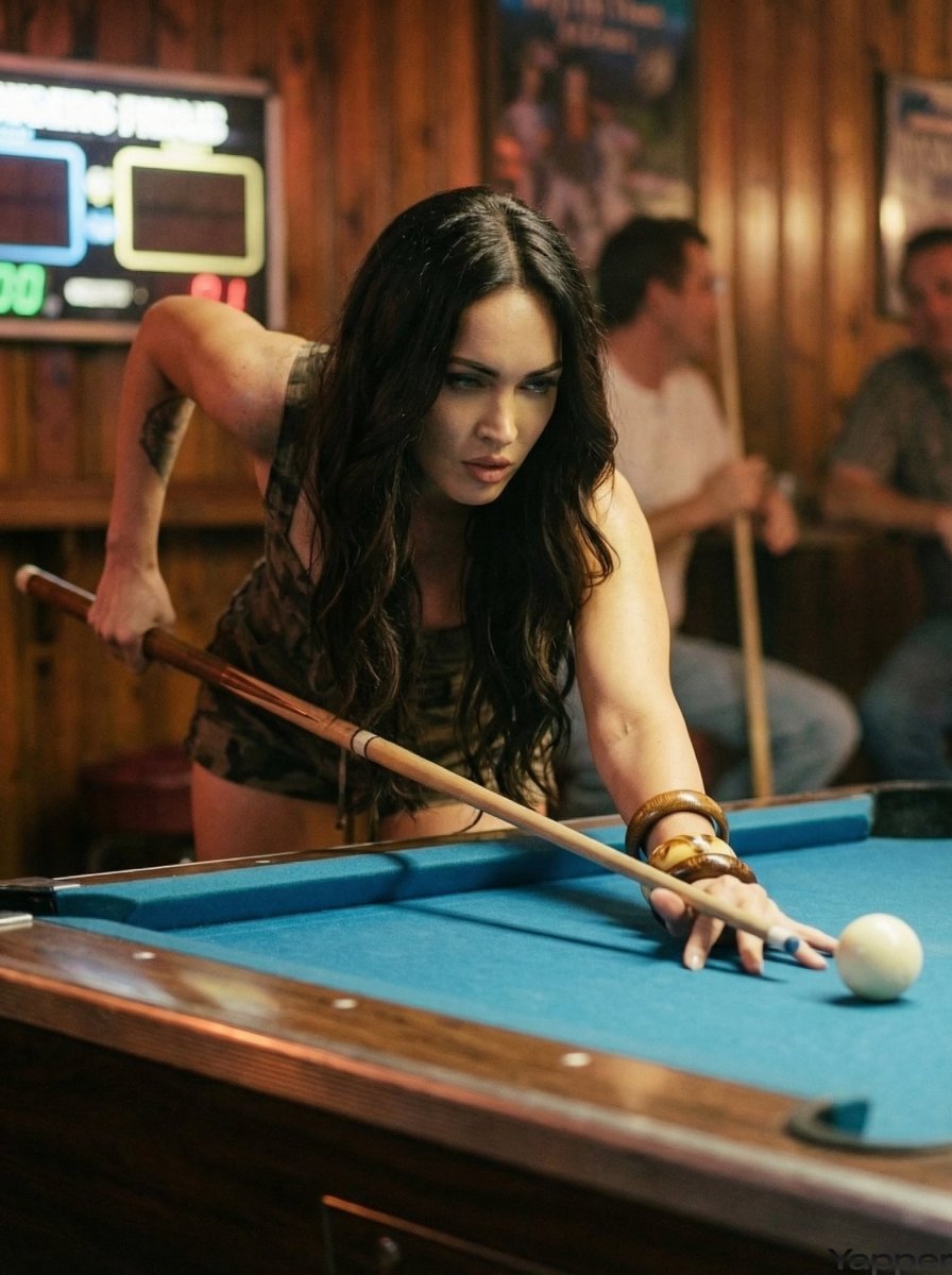 A highly structured JSON prompt for Nano Banana Pro to generate an ultra-photorealistic image of a young woman resembling Megan Fox in a camouflage romper, holding a pool cue in a dimly lit, atmospheric retro pool hall, emphasizing warm cinematic lighting and a 1970s film aesthetic.