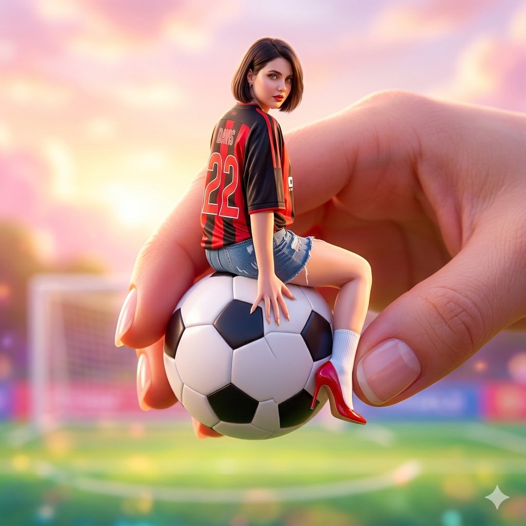 A miniature fashionable girl sitting on a giant soccer ball held between fingers, exaggerated scale contrast, dreamy surreal scene, glossy textures, stylized lighting, vibrant colors, aesthetic Instagram-style composition, soft glowing sky, playful illusion, fantasy realism, hyper-detailed outfit, smooth skin, digital art style, slightly exaggerated proportions, whimsical mood, sharp focus with soft dreamy background