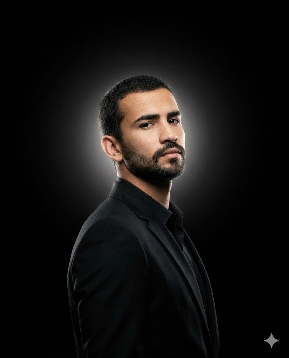 Background: completely black studio environment. Behind the subject’s head, a soft diffused backlight creating a subtle glowing halo with cinematic bloom, not a solid circle. The light softly radiates outward and gradually dissolves into pure black (#000000), creating a gentle atmospheric glow around the silhouette. No visible light source, no hard edges, no textures.