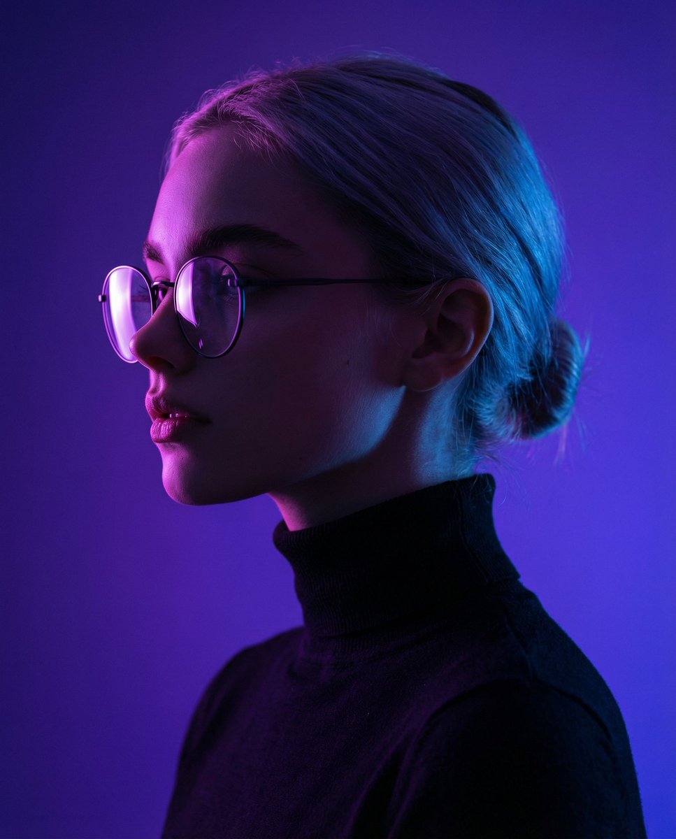 Create a minimalist cinematic side-profile portrait of a young man with round glasses and black turtleneck, Neon purple and blue lighting, high contrast, deep shadows, glowing highlights, gradient background. Ultra-realistic, 85mm, studio, sharp focus, editorial style.