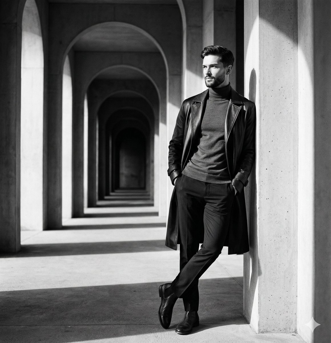 The complete prompt describes a cinematic black and white fashion editorial photograph. The composition follows the rule of thirds with one-point perspective in a 2:3 aspect ratio, featuring asymmetric single subject placement with deep environmental context. The subject is a young Caucasian male with wavy dark hair wearing a black turtleneck, long dark leather trench coat, dark trousers, and Chelsea boots, positioned on the right third of the frame leaning against a stone pillar. His hands are in his coat pockets, right leg crossed casually, looking off-camera with a serious, contemplative expression. The setting is an architectural colonnade with repeating pillars receding to a deep vanishing point on the left. The color palette is monochromatic black and white with high contrast, featuring black (45%), light gray (35%), and mid gray (20%). Lighting is natural side light from archways, providing soft dramatic light on the subject and harsh geometric shadows on the architecture. The mood is dramatic, mysterious, and sophisticated, reminiscent of cinematic noir and brutalist architectural photography. Technical specifications include deep depth of field, film grain, and tack sharp focus on the subject.