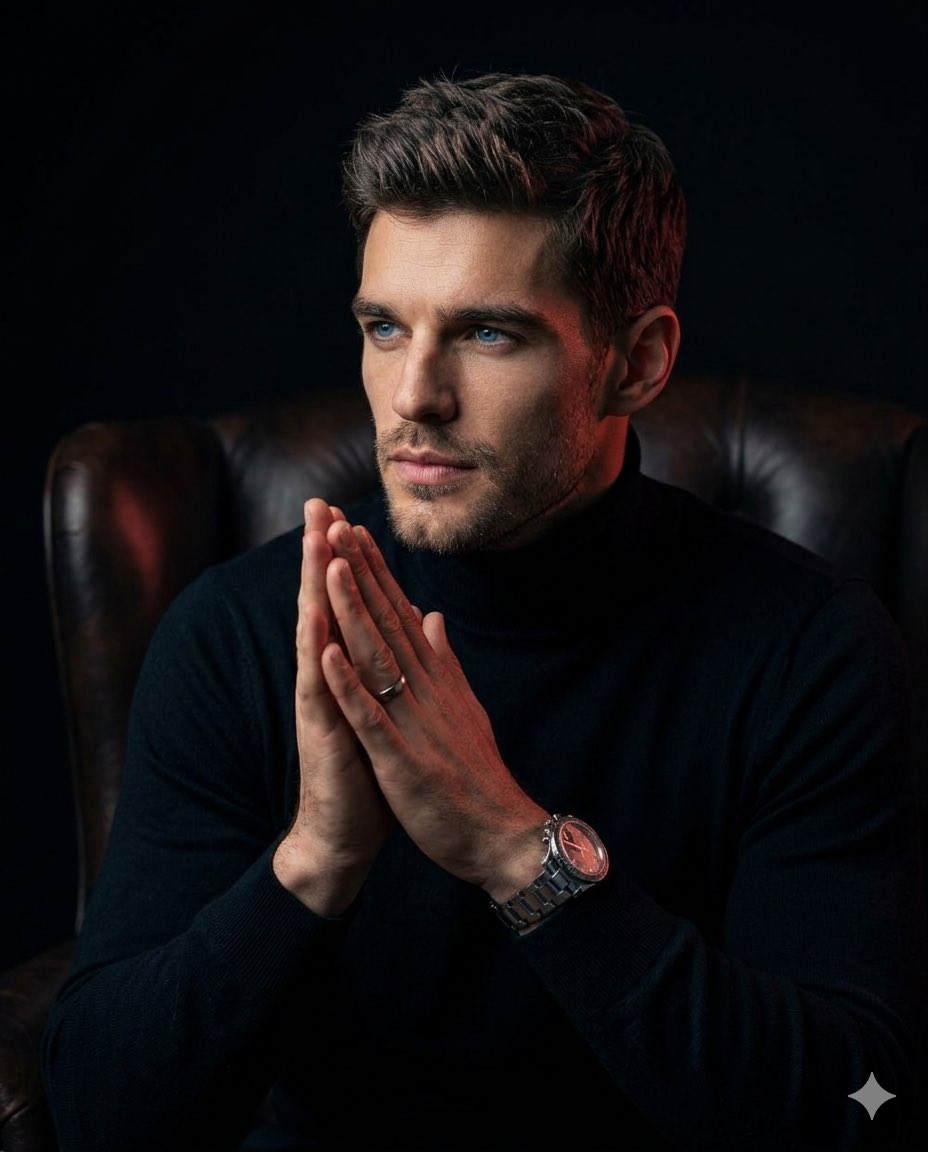 A hyper-realistic cinematic portrait of a {argument name="subject" default="man with short, textured hair and a well-groomed stubble beard"}, captured in a {argument name="aesthetic" default="dark, moody 'night mode'"} aesthetic. The man is sitting in a contemplative pose, hands clasped together near his chest, fingers interlaced, with his gaze directed thoughtfully off-camera to the left. He is wearing a {argument name="clothing" default="premium black high-neck turtleneck sweater"} and a silver-link luxury wristwatch on his left wrist, with a simple band on his right ring finger. The lighting is dramatic and controlled: a soft rim light outlines his silhouette against an almost pitch-black, shadow-drenched background, while a subtle, soft key light illuminates his face and hands. Shallow depth of field, 85mm portrait lens, ultra-sharp focus on the man's expression and clasped hands, with the chair in the background heavily blurred into complete darkness. Minimalist, professional, editorial photography, 4:5 aspect ratio, clean composition focusing strictly on the upper torso and face.Related Nano Banana Pro Prompts