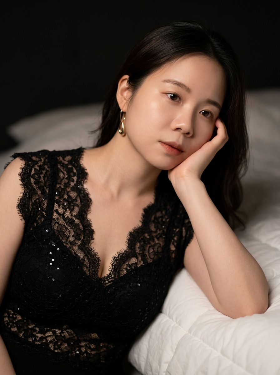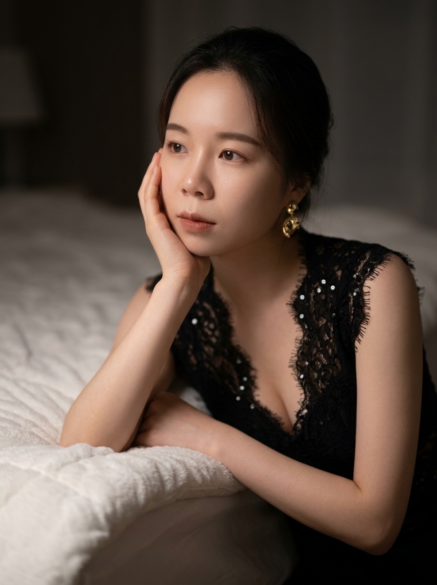 Medium close-up shot from a high angle looking down, professional fashion photography of a beautiful young adult East Asian woman with fair skin, long soft black hair, and dark brown almond-shaped eyes. She is reclining on a bed in a three-quarter view pose, head slightly tilted, her left hand gently touching her right cheek. She has a calm, pensive expression, with a soft, distant gaze looking away from the camera. She wears an elegant black form-fitting top with a deep V-neckline, made of intricate floral lace with eyelash trim and scattered glossy sequins, and a single ornate gold earring in her left ear. The setting is a softly lit bedroom at night, against a dark background and a white fluffy comforter. The scene is illuminated by a single, soft, diffused key light from the front-left, casting subtle shadows on the right side of her face and body. Intimate, serene, and moody atmosphere. Photorealistic 8K, ultra detailed, best quality, sharp focus on face, shallow depth of field with soft background blur (bokeh). Shot on Sony A7R IV with an 85mm f/2.2 lens. natural pose, no exaggeration, stick to visible elements only. **Recommended Parameters:** --ar 3:4 --style raw **Negative Prompt:** blurry, harsh lighting, distorted features, bad anatomy, unnatural pose, watermark, text, oversaturated colors, looking directly at camera