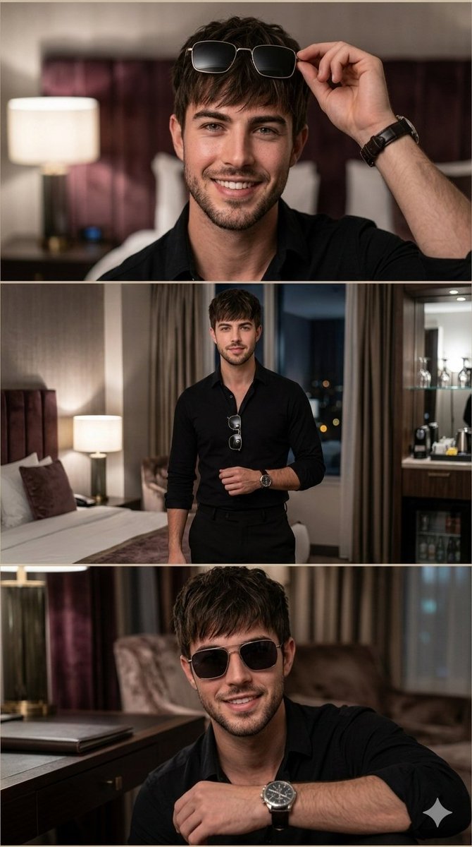 Cinematic multi-frame lifestyle portrait of a stylish young man in a luxury hotel room, three-panel composition (top: close-up adjusting sunglasses, middle: full-body standing pose, bottom: relaxed seated portrait wearing sunglasses), dressed in a sleek black shirt and watch, confident expression, soft warm ambient lighting with bedside lamps, elegant modern interior with bed, curtains, and city lights bokeh in background, shallow depth of field, natural skin texture, editorial fashion photography style, ultra-detailed, 8K.