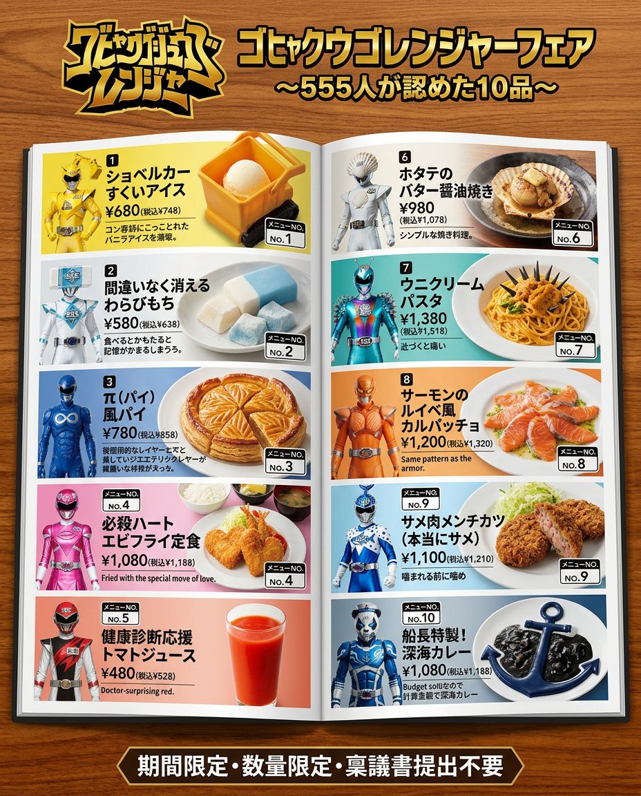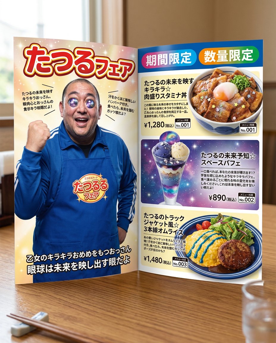 - Match the character representation within the menu pages to the style of the attached image: if the attachment is illustration/anime style, use an illustration; if it is live-action/photo style, use a photo of a real person. In both cases, faithfully reflect the attached visual. Choose one pose randomly from the following: ① Presenting a tray with both hands ② Pointing and promoting a dish ③ Posing with a guts pose in an apron ④ Running while carrying food ⑤ Leaning over the table and whispering a recommendation