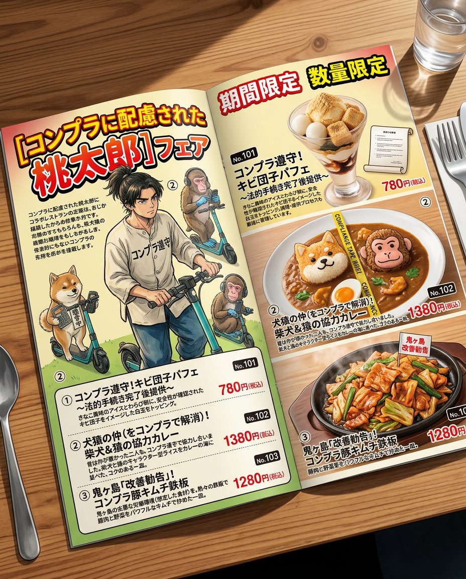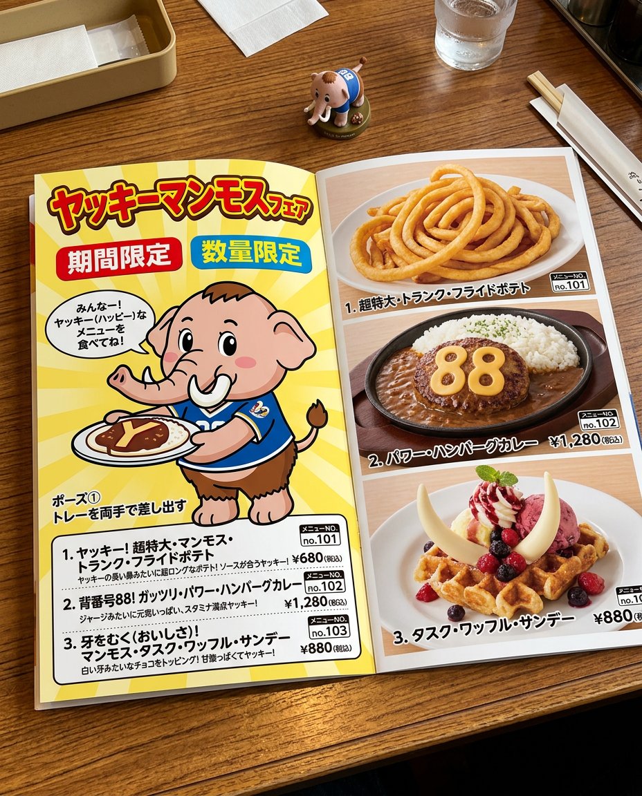 Horizontal spread layout (character x menu introduction on the left page, food photo x price list on the right page).Related Nano Banana Pro Prompts