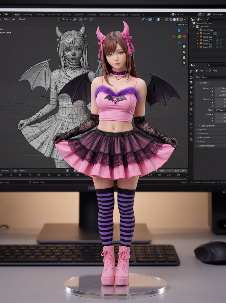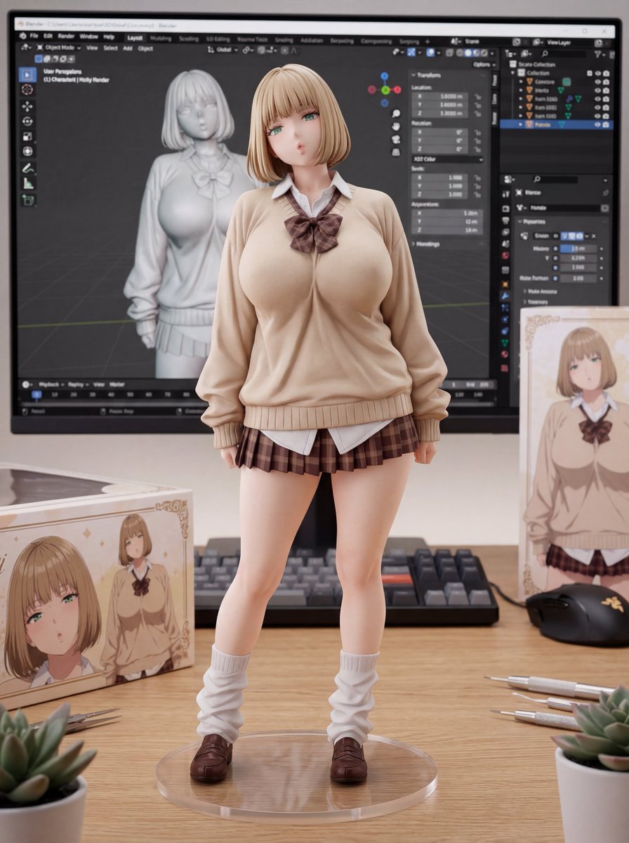 Masterpiece, best quality, (product photography:1.6), macro lens, 8k resolution, (photorealistic:1.5). (Core Subject: High-End PVC Figure): The EXACT character from the input image is rendered as a (high-end 1/7 scale PVC figure:1.6). The figure stands on a clean wooden desk surface, out of the box. (Texture & Quality - CRITICAL): Premium matte plastic skin texture, glossy eye paint, intricate clothing folds, and precise airbrush shading. The figure looks like a tangible, expensive collector's item (Good Smile Company or Alter quality). A clear acrylic circular base supports the figure. (Background: 3D Workspace): Behind the figure, a computer monitor displays a (3D modeling software interface:1.5) (like Blender, Maya, or ZBrush). On the screen: A (grey wireframe mesh or untextured clay render:1.5) of the SAME character is visible. The screen represents the digital prototype of the physical figure. (Surroundings): The figure's retail packaging box stands vertically next to the figure, featuring the character art. A blurred mechanical keyboard and mouse are visible in the background. Soft, professional studio lighting illuminates the figure from above. (Technical Tags): (depth of field:1.4), (bokeh:1.3), (PVC texture:1.5), (figure photography:1.4), (ray tracing), sharp focus on figure face. (Negative prompt): (2D illustration:1.6), (anime style:1.5), (drawing), (sketch), (distorted face:1.5), (melted plastic), (bad painting), (messy desk), (screen off), (wrong character on screen), low quality, blurry.