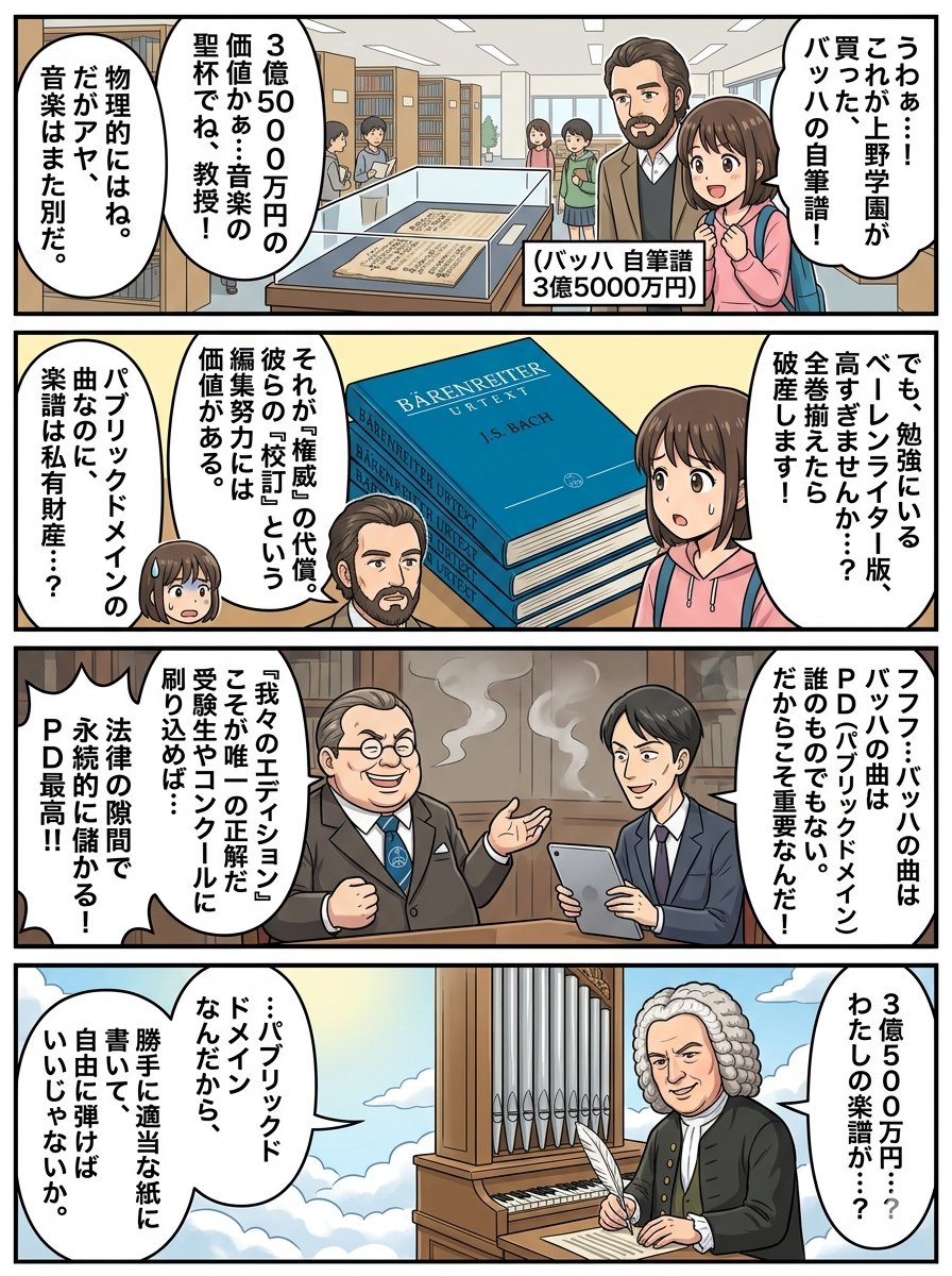 4-panel comic Title "Bach in Heaven, Business on Earth" or "The Light and Shadow of the Critical Edition (Urtext)"