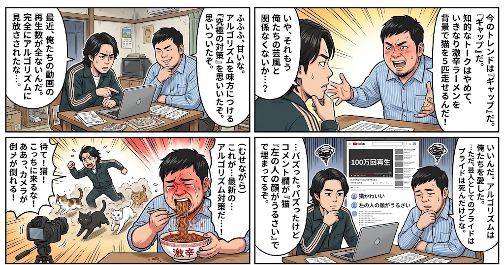 AI Image Generation 4-Panel Manga Title The Formula for Buzz Reiwa Roman style Algorithm countermeasures Experiment Comedian Ranking 1st place Sandwich Man Comedy Skit Ranking 1st place Tokyo 03 Other Trying out 4-panel manga…