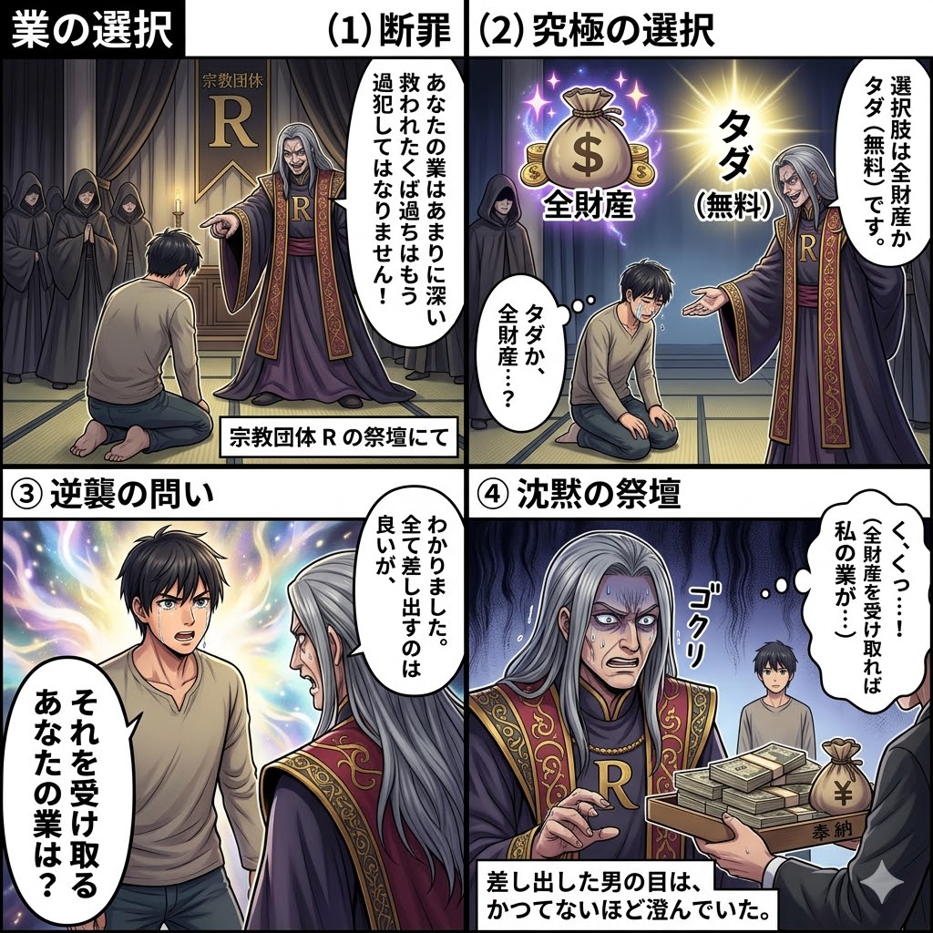 AI Image Generation 4-Panel Manga Title The Ultimate Choice (Religiously) Presenting the 'spiritual cost (karma)' of receiving 'all wealth' rather than its physical value.