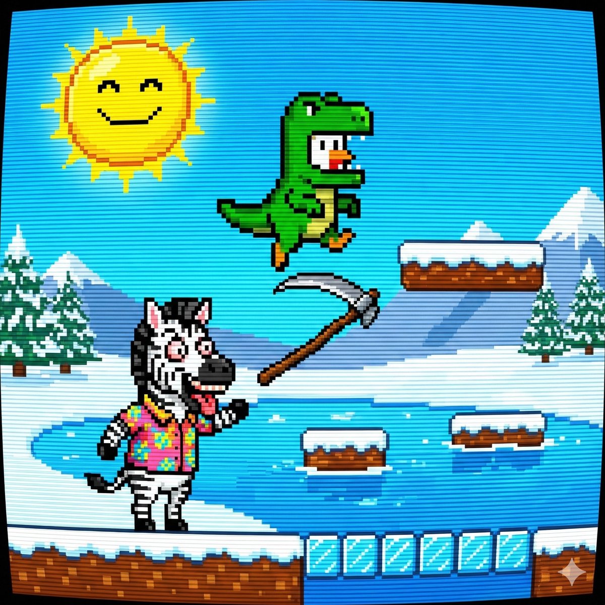 Nano Banana Pro AI image example generated with this reusable CDance AI prompt: A prompt used with Nano Banana Pro (Gemini 3.1 image generator) to create an 8-bit style image of a chicken wearing a T-Rex costume on its…