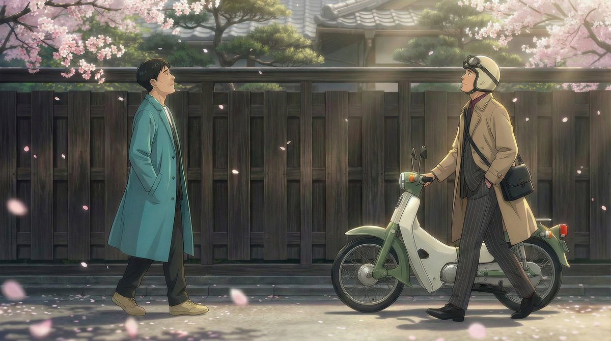 A prompt used with Nano Banana Pro to generate fan art for the #428 fan art challenge, specifically addressing the theme of 'Spring Coat' and featuring the characters Minokawa Minoru and Kitakami Fumio in a scene set in Udagawacho, capturing a moment of intersecting past and future under the spring sunlight.