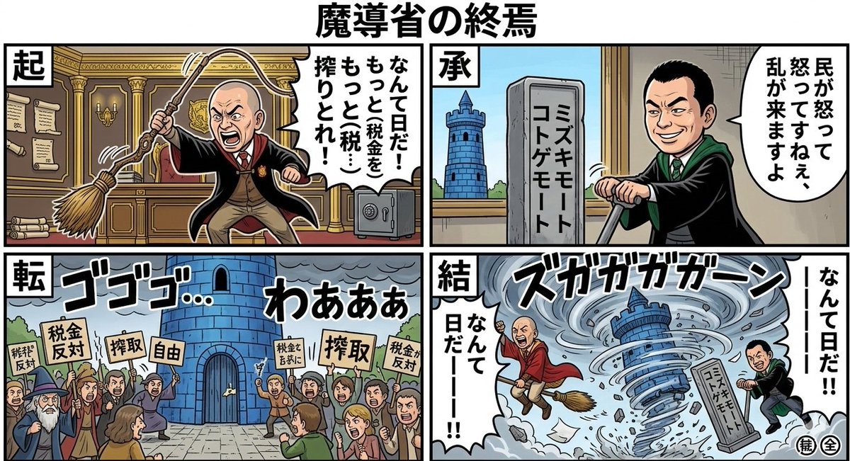 A prompt for Nano Banana Pro (Gemini 3 Pro Image) generating an image related to the comedy duo Viking, featuring characters named Kotogemoto and Mizukimoto, and the 'End of the Ministry of Magic.'